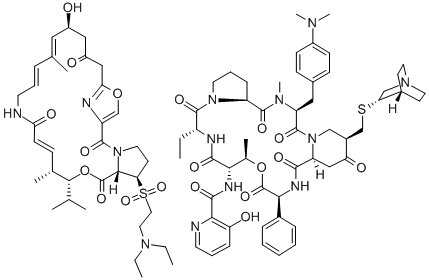 英文名稱:Quinupristin-dalfopristin CAS號:126602-89-9 分子式:C53H67N9O10S.C34H50N4O9S 分子量:1713.09